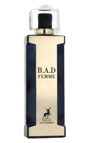 B.A.D. Femme de Maison Alhambra é um perfume Floral Frutado Gourmand Feminino. B.A.D. Femme foi lançado em 2022. As notas de topo são: Bergamota, Amêndoa, Café e Limão. As notas de coração são: Tuberosa, Flor de Laranjeira, Jasmim Sambac, Rosa Búlgara e Raíz de Orris. As notas de fundo são: Fava Tonka, Baunilha, Cacau, Pralinê, Almíscar, Madeira de Cashmere, Sândalo, Patchouli, Cedro, Âmbar e Canela.